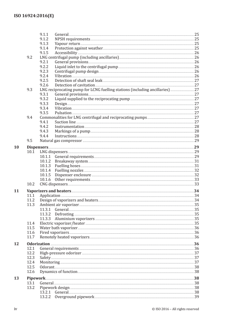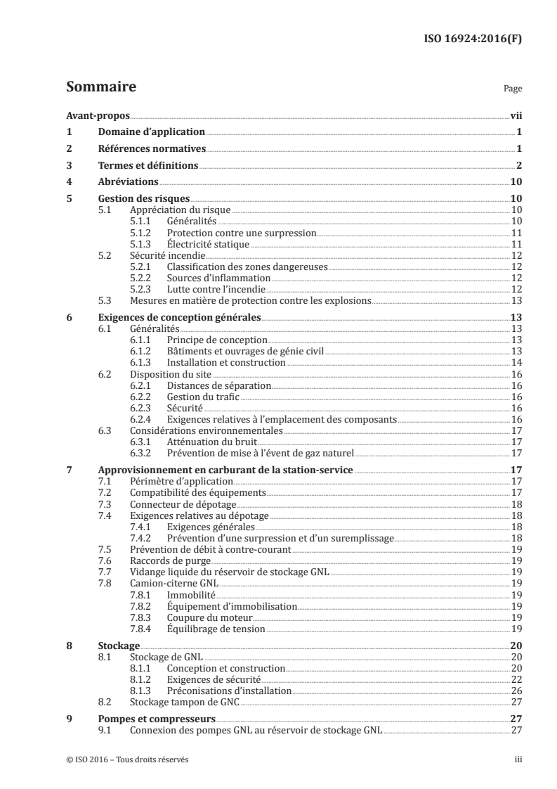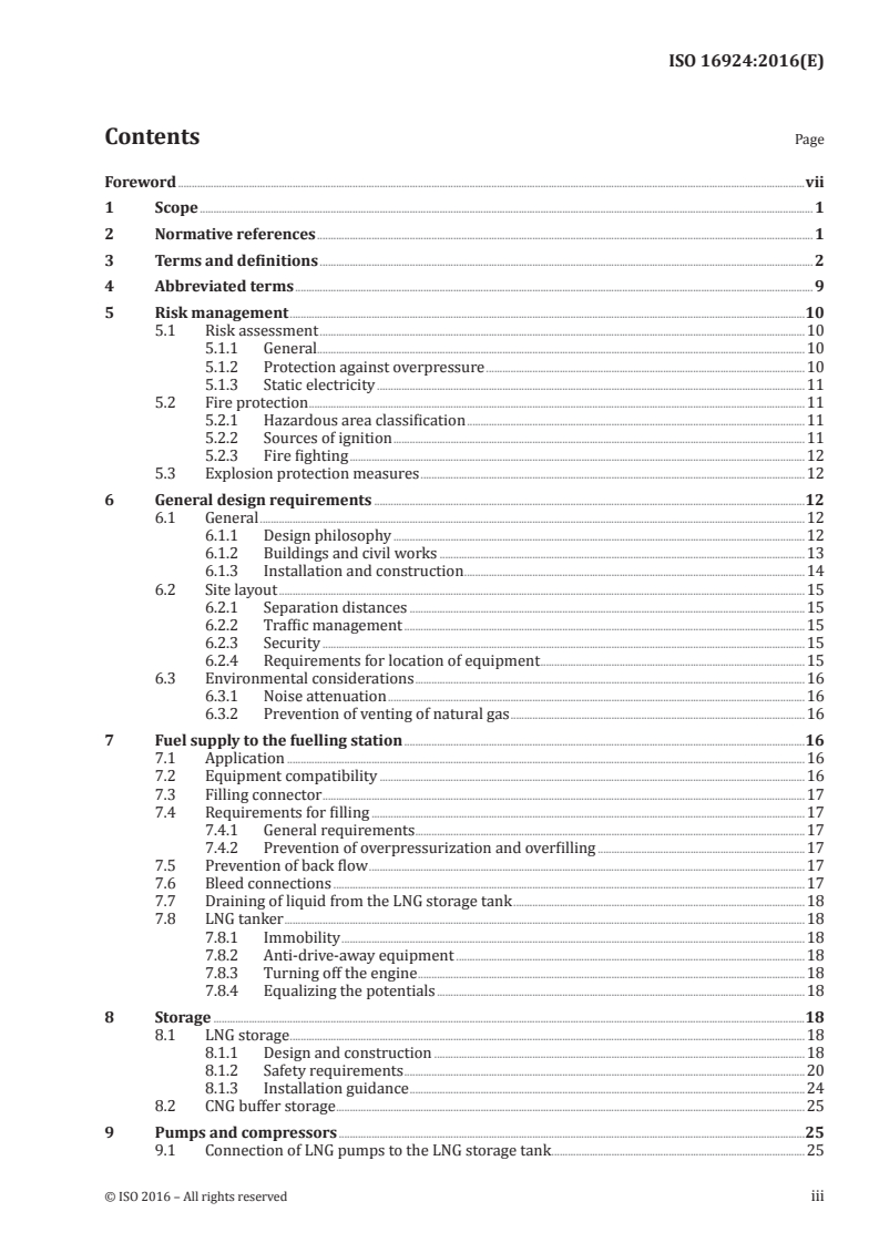 ISO 16924 organizes technical content around safe, operational and environmental aspects of LNG fuelling stations. Major topics include: