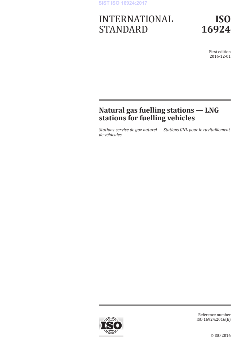 ISO 16924:2016 (identical to ISO 16924:2016) is the international standard for natural gas fuelling stations that use liquefied natural gas (LNG) to fuel vehicles. It specifies requirements for the design, construction, operation, maintenance and inspection of LNG fuelling stations and of LCNG fuelling stations (where LNG is used onsite to produce compressed natural gas). The standard covers equipment, safety and control devices from the LNG storage tank filling connection up to the vehicle fuelling nozzle (the tank filling connection itself and the vehicle nozzle are excluded). It applies to LNG and other liquefied methane‑rich gases that comply with local gas composition regulations or the gas quality requirements of ISO 13686.