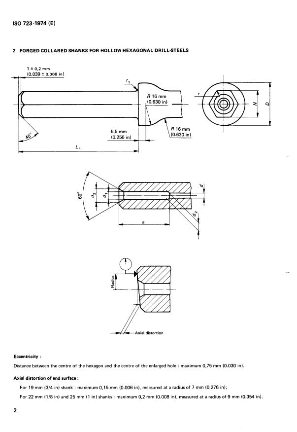 ISO 723:1974 is a standard published by the International Organization for Standardization (ISO). Its full title is "Rock drilling — Forged collared shanks and chuck bushings for hollow hexagonal drill-steels". This standard covers: Rock drilling — Forged collared shanks and chuck bushings for hollow hexagonal drill-steels