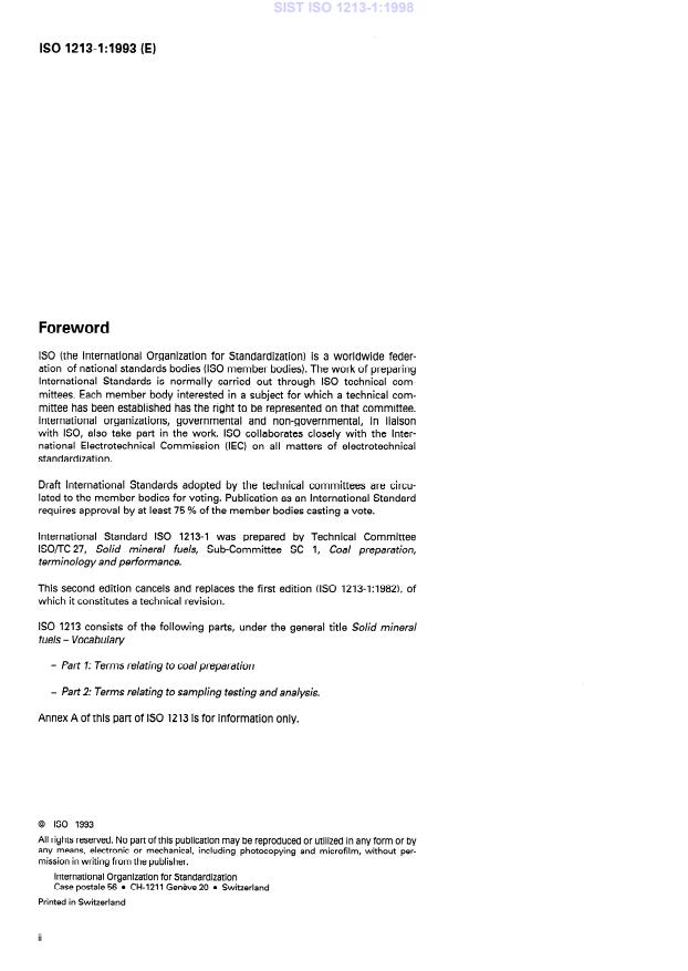 ISO 1213-1:1993 is a standard published by the International Organization for Standardization (ISO). Its full title is "Solid mineral fuels — Vocabulary — Part 1: Terms relating to coal preparation". This standard covers: Defines, in English, 420 terms commonly employed in coal preparation under the following headlines: general terms, sizing, cleaning, separation of solids from water or air, size reduction, expression of results, blending and homogenization, automatic control.