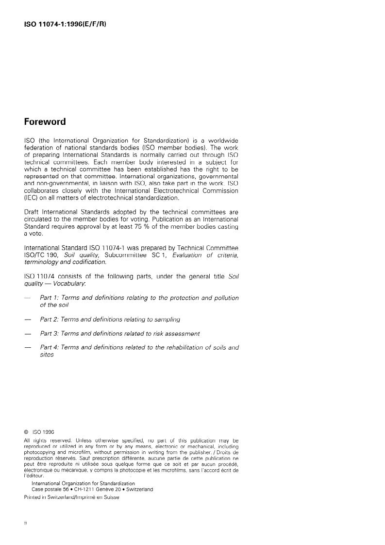 ISO 11074-1:1996 is a standard published by the International Organization for Standardization (ISO). Its full title is "Soil quality — Vocabulary — Part 1: Terms and definitions relating to the protection and pollution of the soil". This standard covers: Defines terms used in certain fields of soil quality characterization. Covers terms relating to soil protection, soil pollution and soil damage.