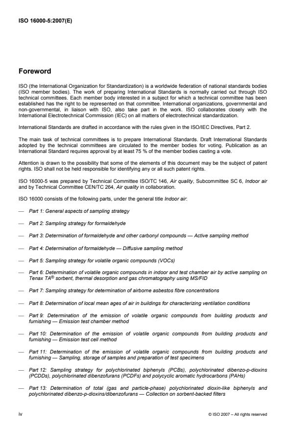 ISO 16000-5:2007 is intended as an aid to planning volatile organic compound (VOC) indoor pollution measurements. In the case of indoor air measurements, the careful planning of sampling and the entire measurement strategy are of particular significance since the result of the measurement may have far-reaching consequences, for example, with regard to the need for remedial action or the success of such an action. An inappropriate measurement strategy may contribute to the complete uncertainty of the measurement result in a larger extent than the measurement procedure itself.