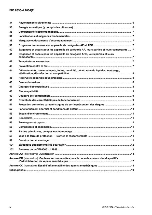 Pour les besoins de l'ISO 8835-4:2004, la CEI 60601-1:1988, Article 1 s'applique, à l'exception de ce qui suit. Ajout: L'ISO 8835-4:2004 spécifie des exigences particulières qui s'appliquent aux performances essentielles des dispositifs d'administration de vapeur anesthésique (DAVA), comme définis en 3.1. La présente partie de l'ISO 8835 couvre les DAVA qui font partie d'un système d'anesthésie et sont conçus pour être sous la surveillance continue d'un opérateur. Les exigences particulières aux DAVA de la présente partie de l'ISO 8835 s'ajoutent aux exigences générales applicables de la CEI 60601-2-13. L'ISO 8835-4:2004ne couvre pas les DAVA conçus pour être utilisés avec des anesthésiques inflammables, tels que déterminés selon l'Annexe CC, ni ceux conçus pour être utilisés dans des systèmes respiratoires d'anesthésie (par exemple les systèmes à alimentation en vapeur). Les exigences de la présente partie de l'ISO 8835-4:2004 qui remplacent ou modifient les exigences de la CEI 60601-1:1988, ainsi que ses Amendements 1 (1991) et 2 (1995), sont prévues pour avoir la priorité sur les exigences générales correspondantes.