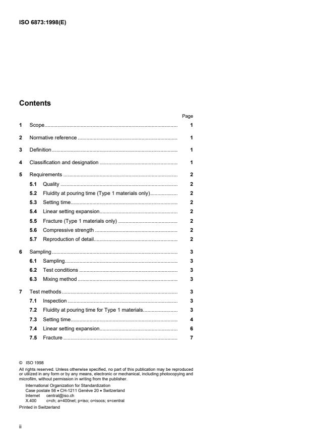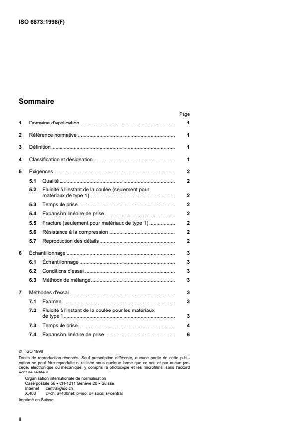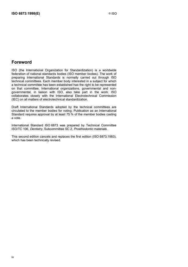 ISO 6873:1998 is a standard published by the International Organization for Standardization (ISO). Its full title is "Dental gypsum products". This standard covers: La présente Norme internationale donne une classification des, et spécifie les exigences relatives aux, produits à base de gypse utilisés à des fins dentaires, telles que la prise d'empreintes buccales, la fabrication de modèles, de moulages ou de matrices. Elle spécifie les méthodes d'essai à appliquer pour déterminer la conformité à ces exigences. Elle renferme également des prescriptions concernant l'étiquetage des emballages et les instructions appropriées accompagnant chaque emballage.