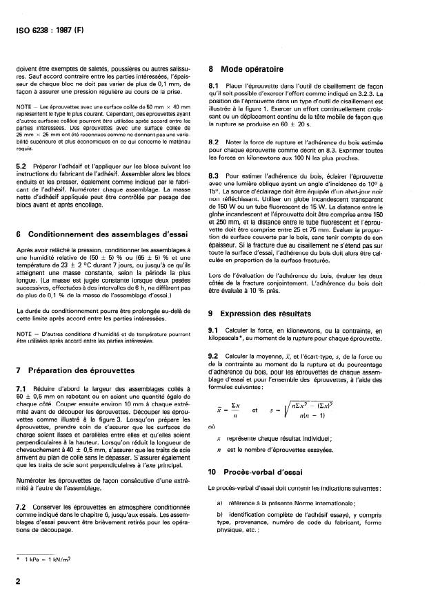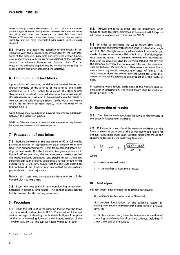 ISO 6238:1987 is a standard published by the International Organization for Standardization (ISO). Its full title is "Adhesives — Wood-to-wood adhesive bonds — Determination of shear strength by compression loading". This standard covers: Adhesives — Wood-to-wood adhesive bonds — Determination of shear strength by compression loading