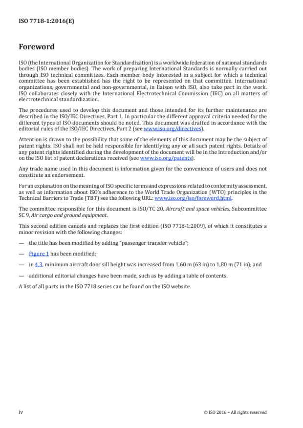 ISO 7718-1:2016 is a standard published by the International Organization for Standardization (ISO). Its full title is "Aircraft — Passenger doors interface requirements for connection of passenger boarding bridge or passenger transfer vehicle — Part 1: Main deck doors". This standard covers: ISO 7718-1:2016 specifies minimum requirements for dimensions and unobstructed space around main deck passenger doors of future types of civil-passenger transport aircraft when they are intended to be compatible with the thousands of passenger boarding bridges and passenger transfer vehicles existing, or being planned, in airports worldwide. ISO 7718-1:2016 is not applicable to existing models of civil transport aircraft, or derivative models with entry into service up to year 2000 with the same fuselage, for which the aircraft-mating section of passenger boarding bridges or passenger transfer vehicles is expected to be compatible with ISO 16004. It is not the intent of this document to restrict in any way the basic design of any future types of civil-passenger transport aircraft. However, it aims at clarifying, for aircraft-design engineers, the design characteristics which would make it difficult or impossible for a new type of aircraft to adequately connect with existing airport passenger boarding bridges or passenger transfer vehicles. If basic aircraft-design requirements impose on a future model certain dimensional characteristics not complying with this document, note that: - either alternative methods of embarking/disembarking passengers will need to be implemented, such as integral aircraft stairs, etc.; - or existing passenger boarding bridges and/or passenger transfer vehicles in the airports where such a new type of aircraft is to operate will require some degree of modification/reworking; - or additional interface devices/equipment will be required in order to connect such a new type of aircraft with existing passenger boarding bridges and passenger transfer vehicles. Each case results in increased aircraft-handling constraints and operating cost.