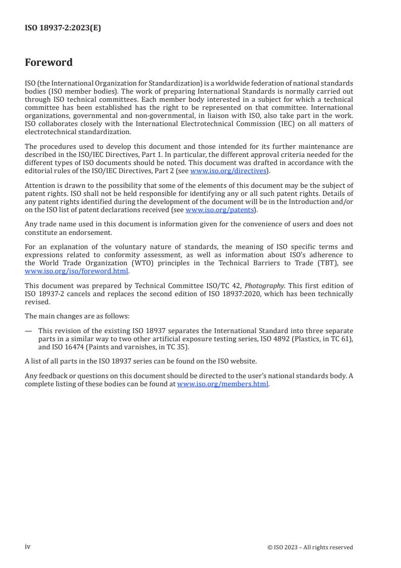 ISO 18937-2:2023 specifies laboratory methods for measuring the indoor light stability (lightfastness) of photographic materials using a filtered xenon‑arc lamp. It covers test equipment, filters, exposure conditions (irradiance/illuminance), temperature and relative humidity control, and measurement/reporting procedures for colour and monochrome reflection prints, transparent/translucent films, photobooks and prints for backlit displays. The procedures simulate two common end‑use scenarios: general indoor display (indirect, window‑filtered daylight in homes) and simulated in‑window display (terrestrial daylight transmitted through architectural double glazing).