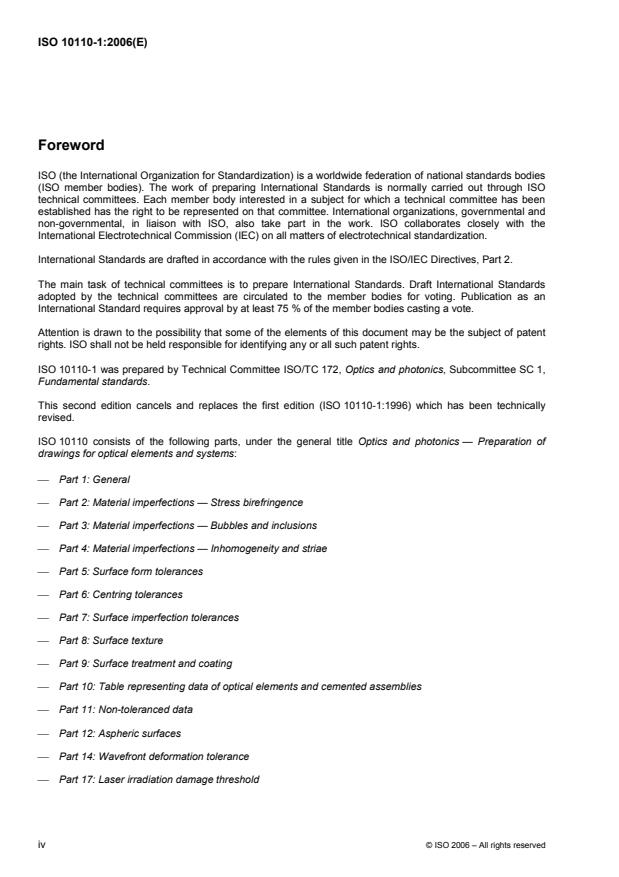 ISO 10110-1:2006 is a standard published by the International Organization for Standardization (ISO). Its full title is "Optics and photonics — Preparation of drawings for optical elements and systems — Part 1: General". This standard covers: The ISO 10110 series of International Standards specifies the presentation of design and functional requirements for optical elements and systems in technical drawings used for manufacturing and inspection. ISO 10110-1:2006 specifies the presentation in drawings of the characteristics, especially the tolerances, of optical elements and systems.