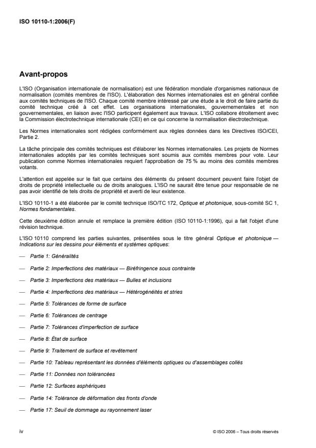 La série de Normes internationales ISO 10110 spécifie la représentation des exigences de conception et des exigences fonctionnelles des éléments et systèmes optiques, sur les dessins techniques utilisés pour la fabrication et le contrôle. L'ISO 10110-1:2006 spécifie la représentation dans les dessins des caractéristiques, en particulier les tolérances, des éléments et des systèmes optiques.
