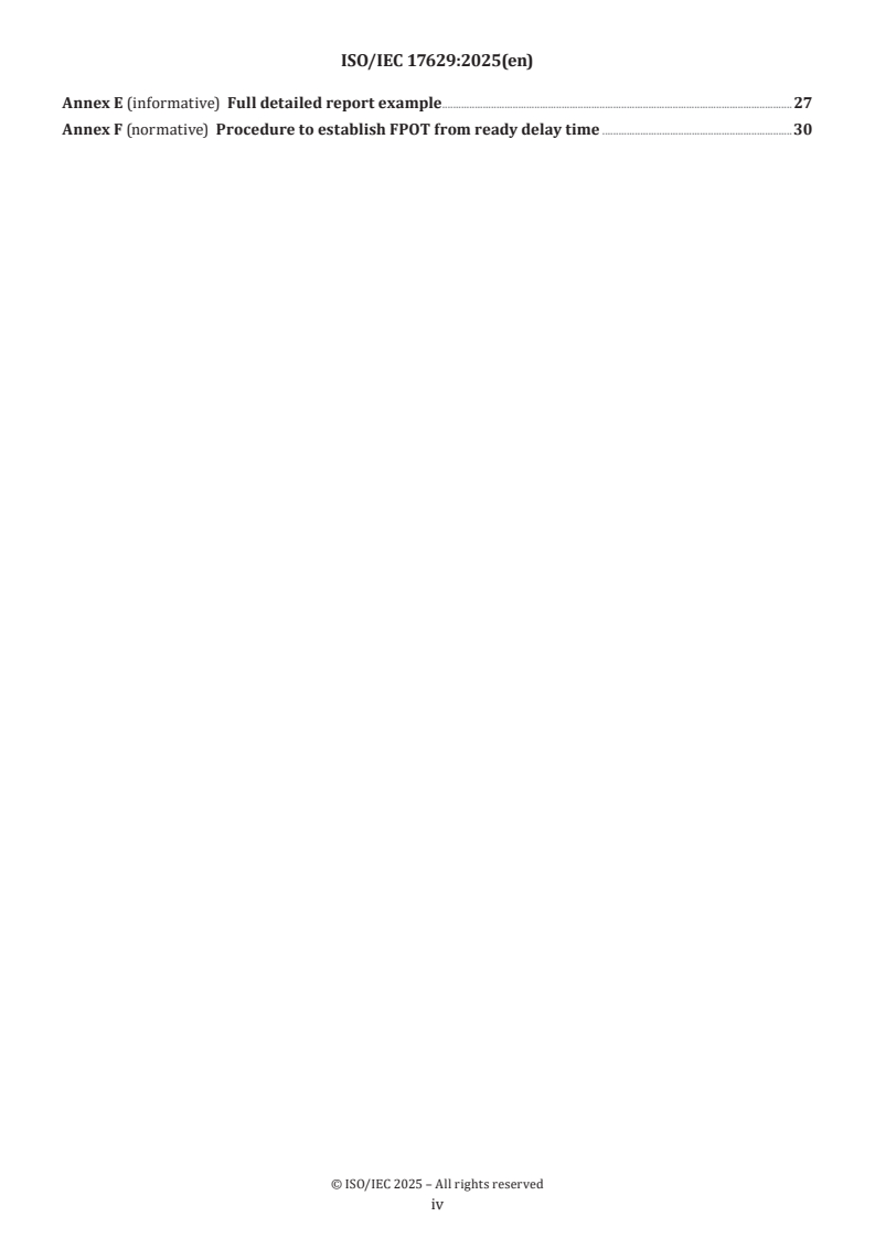 - Normative and informative annexes: test-platform parameters (Annex A), test suite (Annex B), report presentation and examples (Annex C–E), and a procedure to establish FPOT from ready delay time (Annex F).