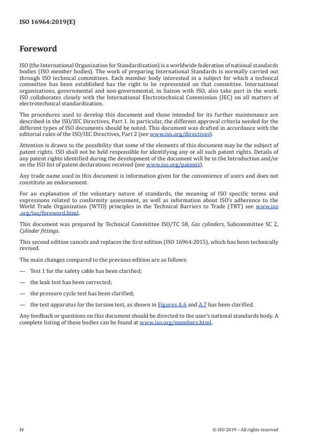 ISO 16964:2019 is a standard published by the International Organization for Standardization (ISO). Its full title is "Gas cylinders — Flexible hoses assemblies — Specification and testing". This standard covers: This document provides specification and testing requirements for high pressure flexible hose assemblies intended to be connected to gas cylinders, bundles of cylinders or trailers (battery vehicles), and MEGCs for use when filling and emptying gas at production sites and also for customer use. This document applies to flexible hose assemblies with rated pressures up to 1 000 bar for use in the temperature range of −40 °C to +65 °C. This document is not applicable to: — rubber and plastics flexible hose assemblies for welding, cutting and related processes up to 45 MPa (450 bar) for customer use (see ISO 14113); — high pressure flexible hose assemblies for use with medical gas systems for customer use (see ISO 21969); — low pressure hose assemblies for use with medical gases for customer use (see ISO 5359); — rubber and thermoplastic low pressure hose assemblies for welding, cutting and related processes for customer use (see ISO 3821 or ISO 12170); — flexible hose assemblies for cryogenic applications (see ISO 21012); — flexible hose assemblies for liquid petroleum gas (LPG). NOTE Flexible hose assembly designs which pass the type test approval described in this document can have a lower ratio of burst pressure to rated pressure than stated in other standards.