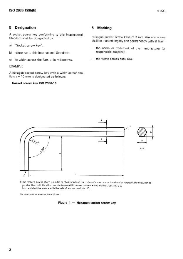 ISO 2936:1995 is a standard published by the International Organization for Standardization (ISO). Its full title is "Assembly tools for screws and nuts — Hexagon socket screw keys". This standard covers: Assembly tools for screws and nuts — Hexagon socket screw keys