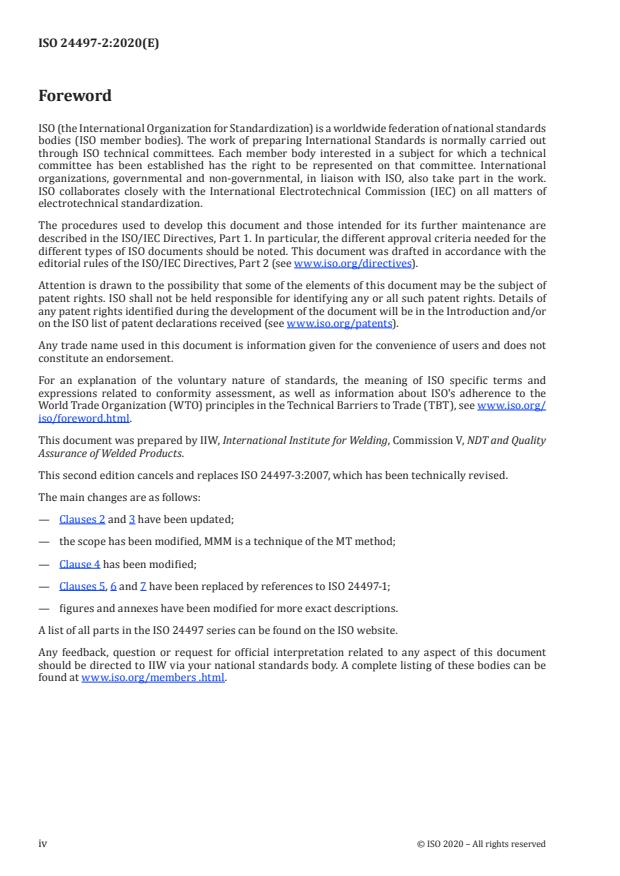 ISO 24497-2:2020 is a standard published by the International Organization for Standardization (ISO). Its full title is "Non-destructive testing — Metal magnetic memory — Part 2: Inspection of welded joints". This standard covers: This document specifies general requirements for the application of the non-destructive (NDT) metal magnetic memory (MMM) testing technique of the magnetic testing method for quality assurance of welded joints. This document can be applied to welded joints in any type of ferromagnetic products: pipelines, vessels, equipment, and metal constructions, as agreed with the purchaser.
