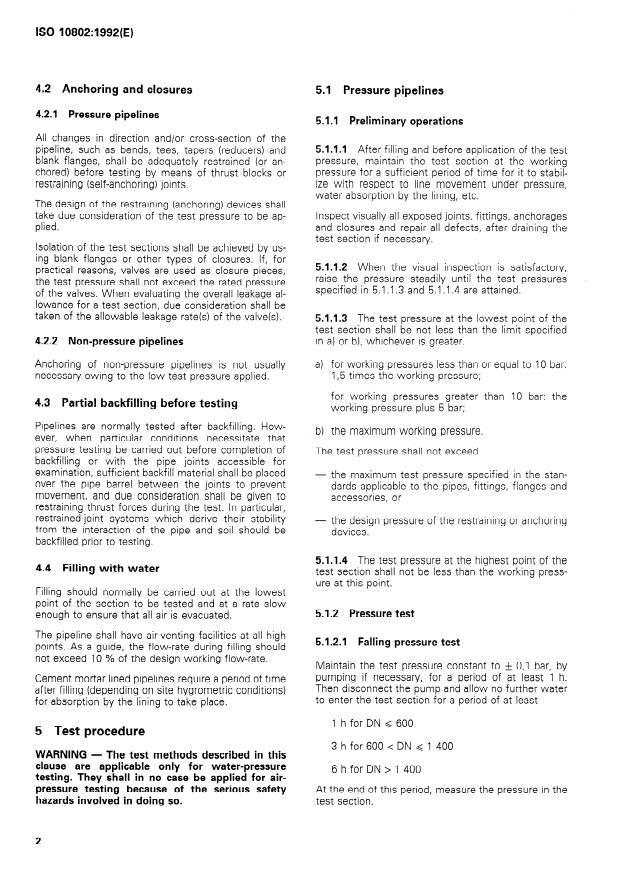 ISO 10802:1992 - Ductile iron pipelines -- Hydrostatic testing after installation