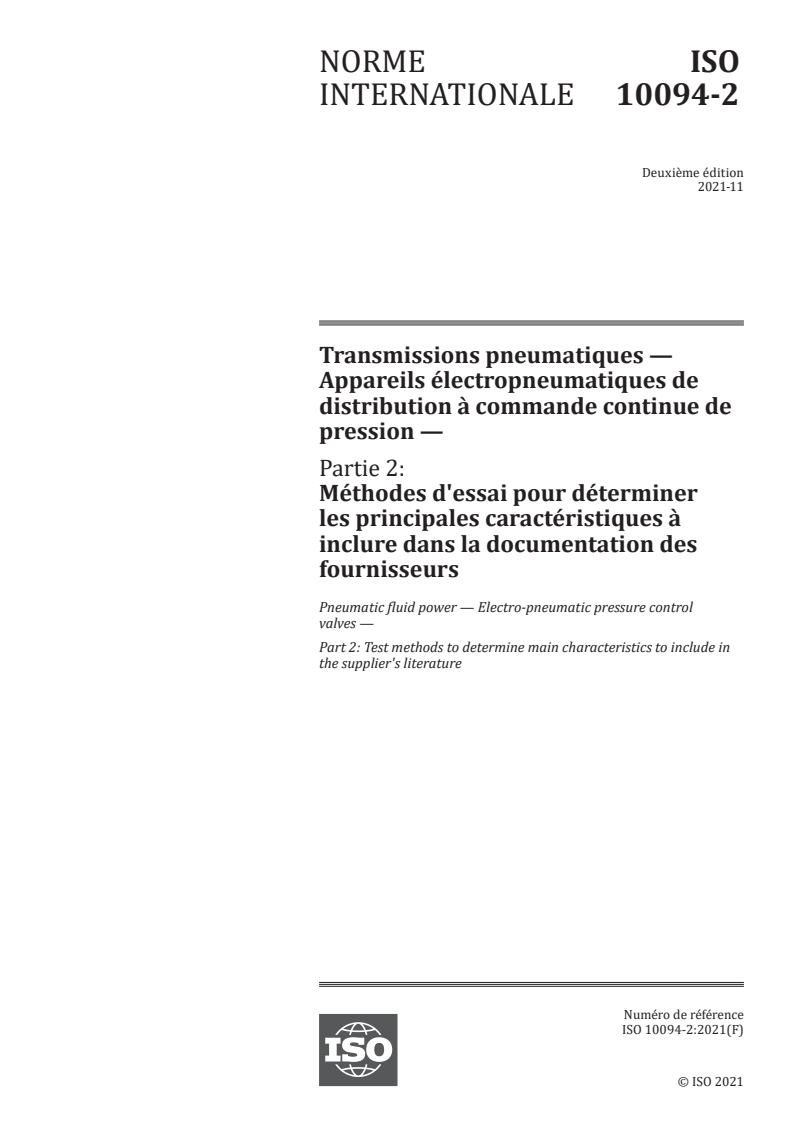 Keywords: ISO 10094-2:2021, electro‑pneumatic pressure control valves, pneumatic fluid power, test methods, supplier’s literature, static characteristics, dynamic response, leakage, hysteresis.
