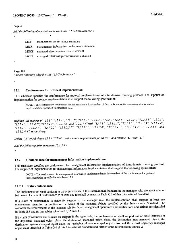 ISO/IEC 10589:1992/Amd 1:1996 is a standard published by the International Organization for Standardization (ISO). Its full title is "Information technology — Telecommunications and information exchange between systems — Intermediate system to Intermediate system intra-domain routeing information exchange protocol for use in conjunction with the protocol for providing the connectionless-mode Network Service (ISO 8473) — Amendment 1: Implementation conformance statement proformas". This standard covers: Information technology — Telecommunications and information exchange between systems — Intermediate system to Intermediate system intra-domain routeing information exchange protocol for use in conjunction with the protocol for providing the connectionless-mode Network Service (ISO 8473) — Amendment 1: Implementation conformance statement proformas