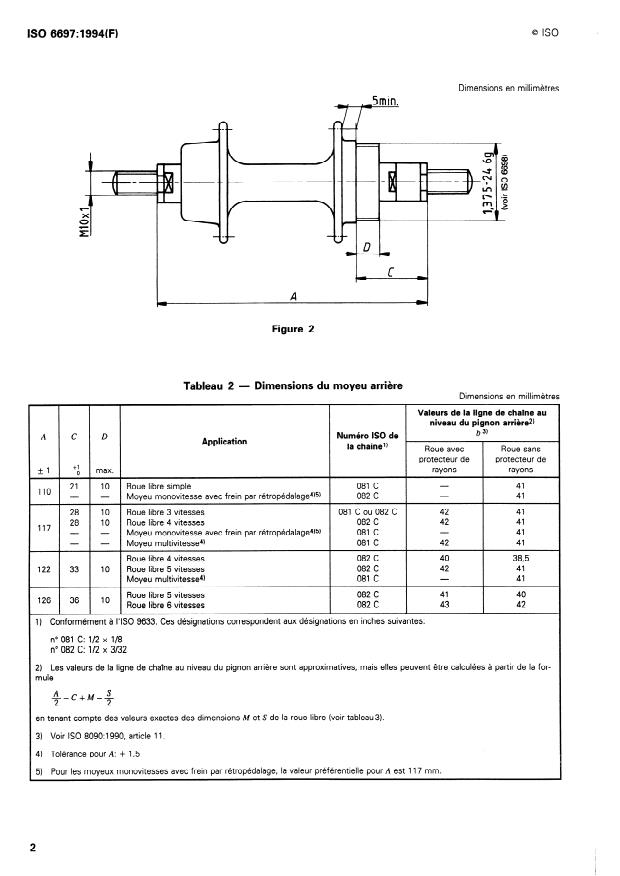 Dimensions such as axle threading, width, chain line positions, and freewheel tolerances are standardized. Tables accompanying the standard provide millimetric values for:- Axle diameter and threading (e.g., M8 x 1)