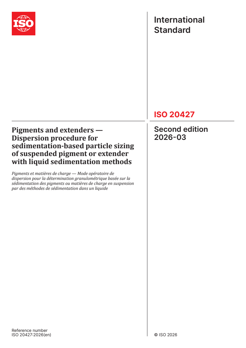 ISO 20427:2026 - Pigments and extenders — Dispersion procedure for sedimentation-based particle sizing of suspended pigment or extender with liquid sedimentation methods