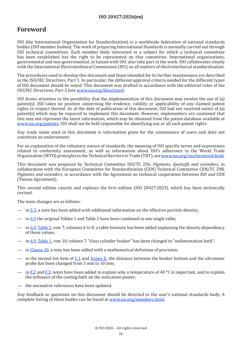 ISO 20427:2026 is a standard published by the International Organization for Standardization (ISO). Its full title is "Pigments and extenders — Dispersion procedure for sedimentation-based particle sizing of suspended pigment or extender with liquid sedimentation methods". This standard covers: This document specifies sample preparation methods to determine the size distribution of separate particles of a single pigment or extender, which is dispersed in a liquid by application of a standardized dispersion procedure, using an ultrasonic device, shaker device or wet jet mill. The sample preparation methods described are optimized for measurements carried out with a particle sizing technique based on sedimentation. This technique relies on particle migration due to gravitation or centrifugal forces and requires a density contrast between the particles and the liquid phase.