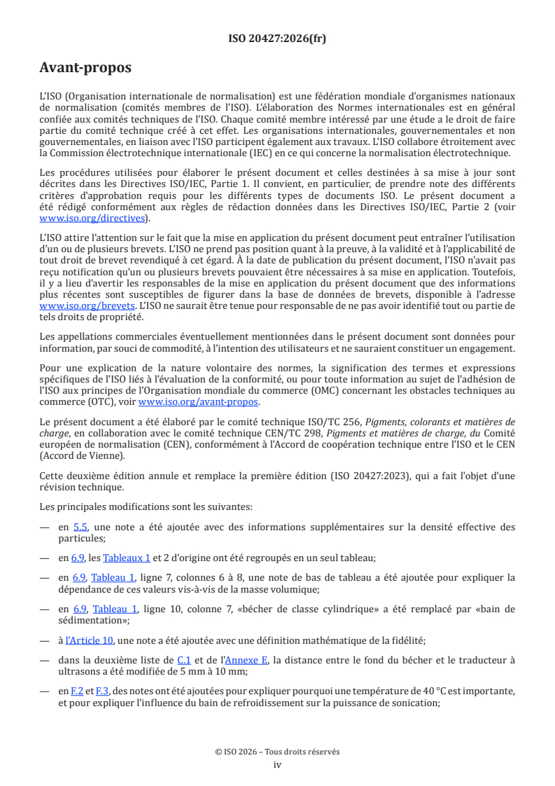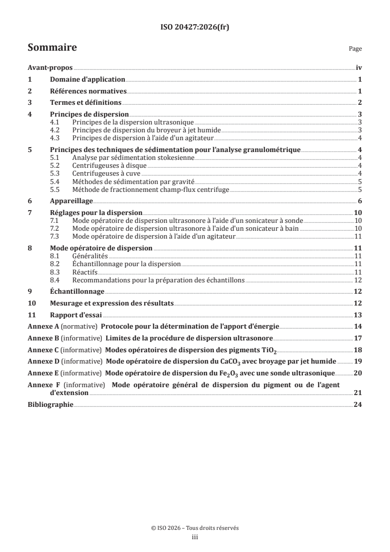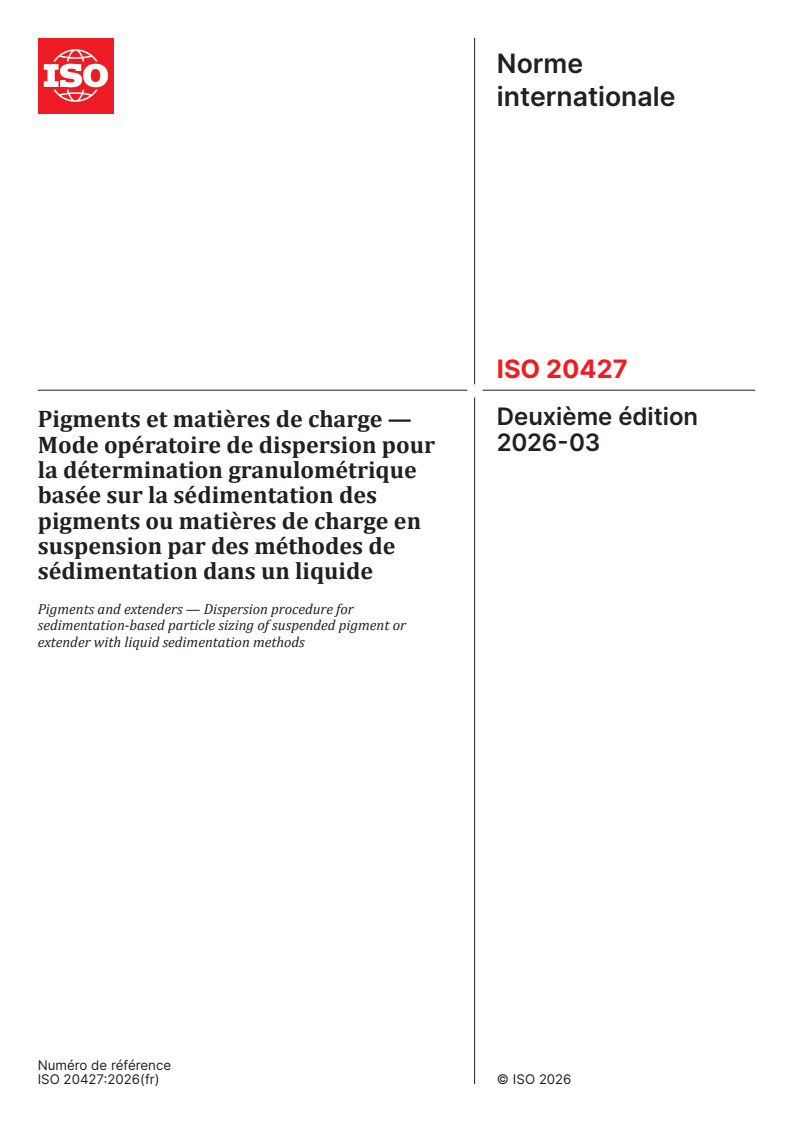 ISO 20427:2026 - Pigments et matières de charge — Mode opératoire de dispersion pour la détermination granulométrique basée sur la sédimentation des pigments ou matières de charge en suspension par des méthodes de sédimentation dans un liquide