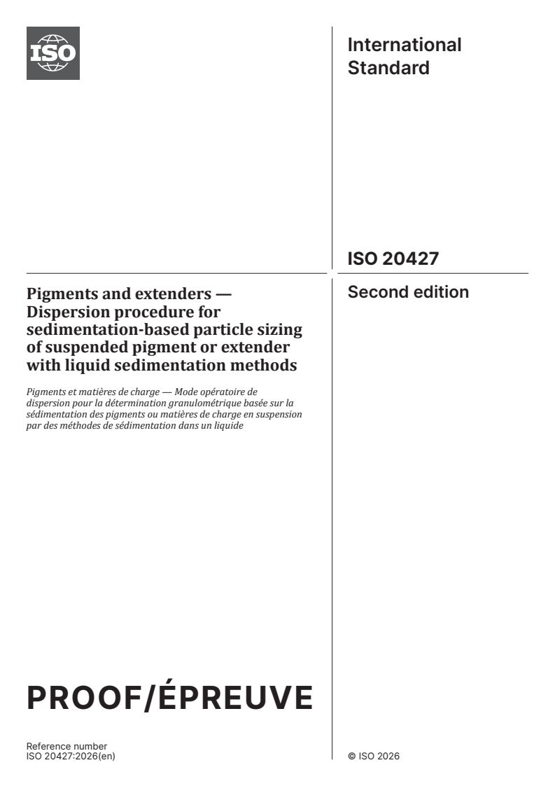 ISO/PRF 20427 - Pigments and extenders — Dispersion procedure for sedimentation-based particle sizing of suspended pigment or extender with liquid sedimentation methods Released:23. 01. 2026