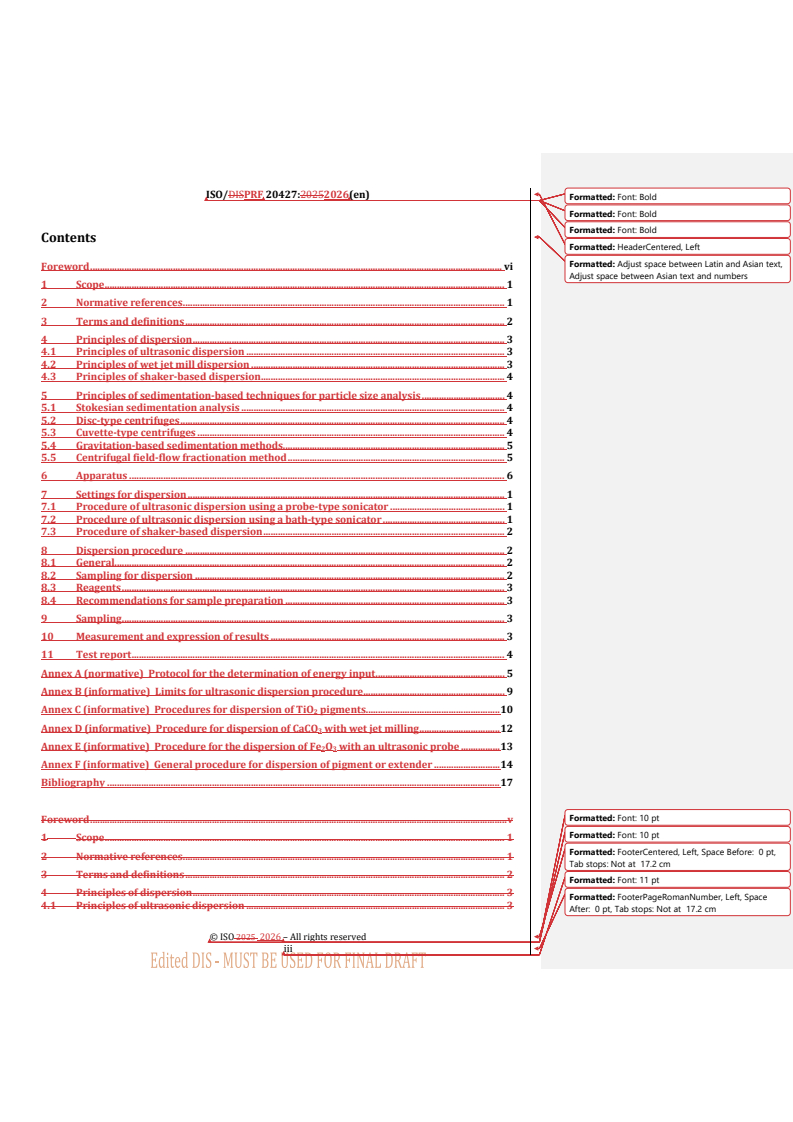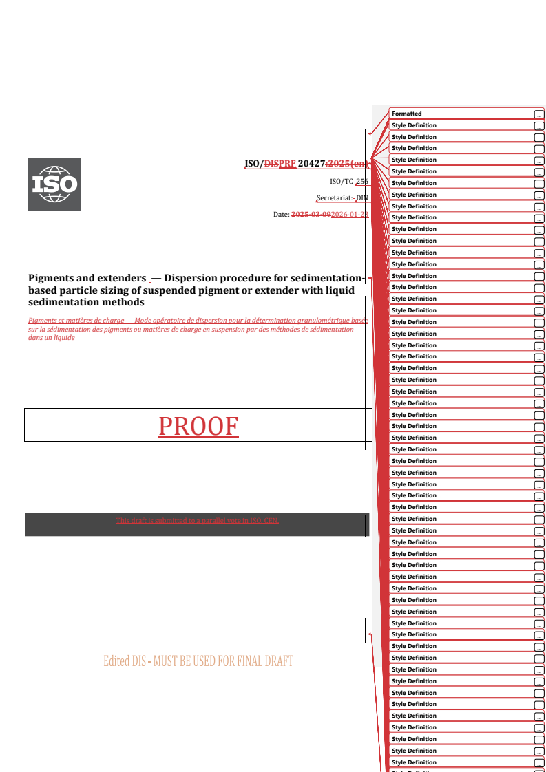 REDLINE ISO/PRF 20427 - Pigments and extenders — Dispersion procedure for sedimentation-based particle sizing of suspended pigment or extender with liquid sedimentation methods Released:23. 01. 2026