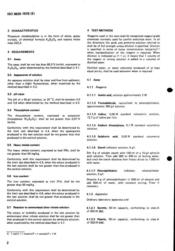 ISO 3629:1976 is a standard published by the International Organization for Standardization (ISO). Its full title is "Photographic grade potassium metabisulphite — Specification". This standard covers: Photographic grade potassium metabisulphite — Specification
