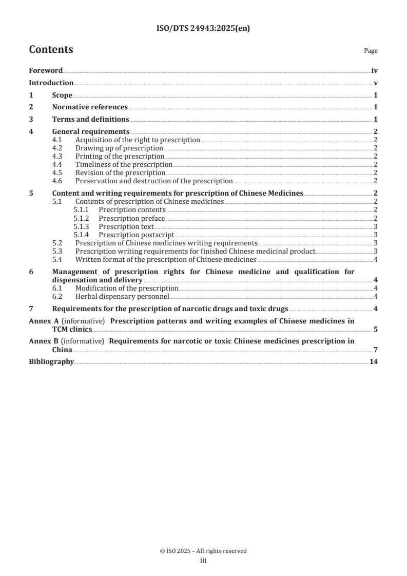 ISO/DTS 24943 is a draft published by the International Organization for Standardization (ISO). Its full title is "Traditional Chinese medicine — Requirements for decoction pieces prescription". This standard covers: This document specifies the general requirements, content, and writing requirement for decoction pieces prescription. It regulates qualification of prescription writing, prescription of precious medicines, prescription of toxic and anesthetic medicines, and institution-based prescription, etc.
