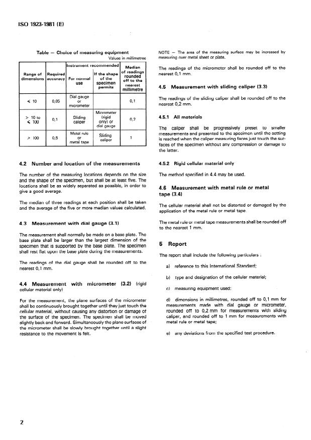 ISO 1923:1981 is a standard published by the International Organization for Standardization (ISO). Its full title is "Cellular plastics and rubbers - Determination of linear dimensions". This standard covers: Specification of the characteristics and the choice of the measuring equipment and procedure for determination of the linear dimensions of sheets, blocks or test specimens of ceelular material (flexible and rigid). Depending on the range of the dimensions to be measured different measuring instruments are recommended.