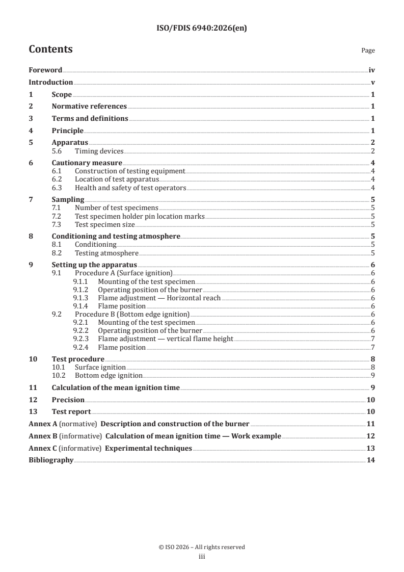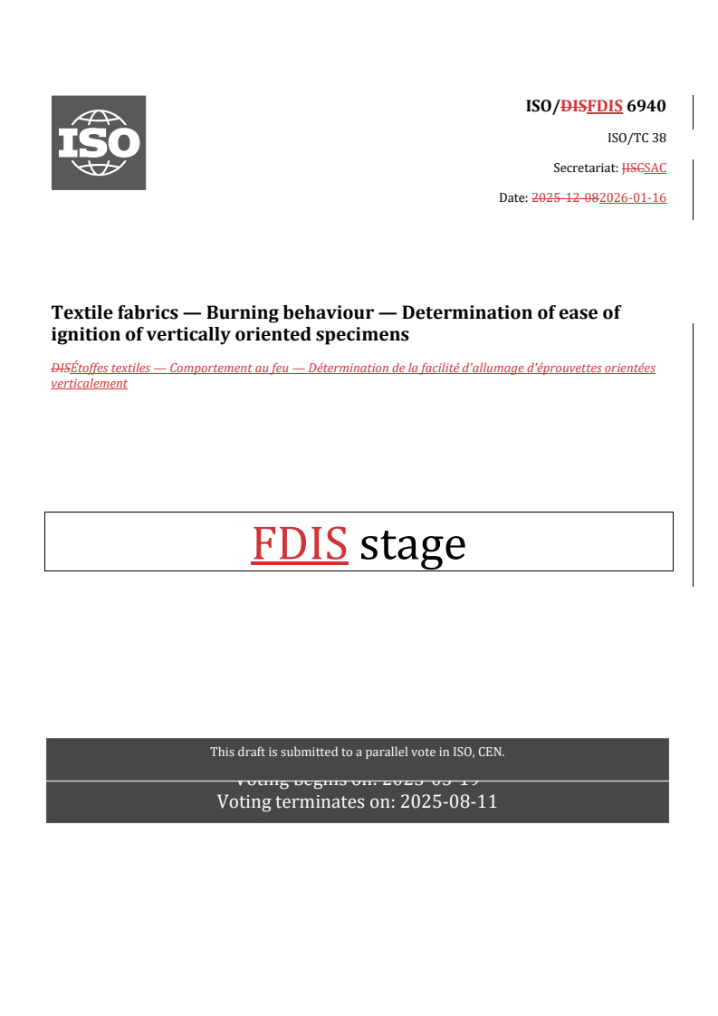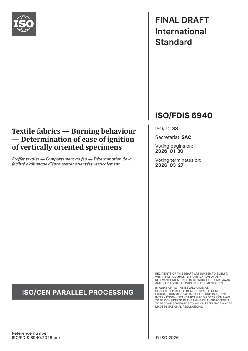 ISO/FDIS 6940 - Textile fabrics — Burning behaviour — Determination of ease of ignition of vertically oriented specimens Released:16. 01. 2026