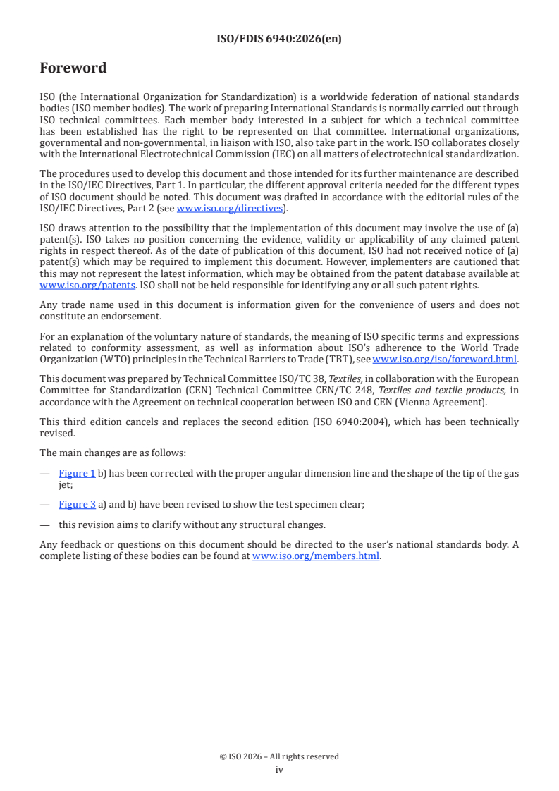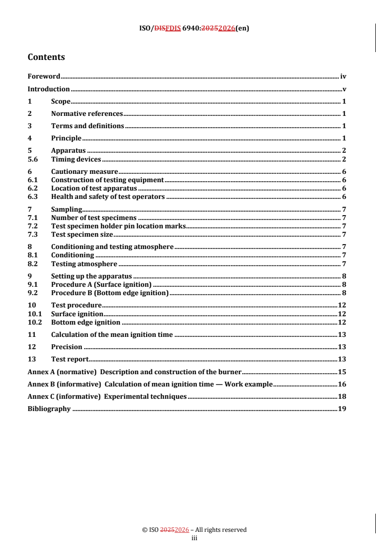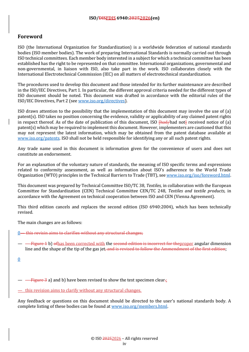 REDLINE ISO/FDIS 6940 - Textile fabrics — Burning behaviour — Determination of ease of ignition of vertically oriented specimens Released:16. 01. 2026