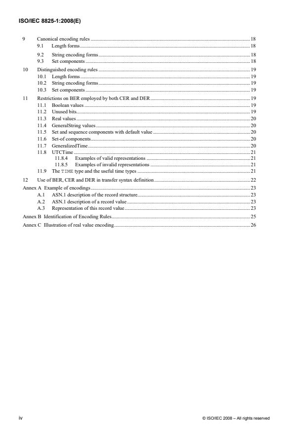 ISO/IEC 8825-1:2008 specifies a set of basic encoding rules that can be used to derive the specification of a transfer syntax for values of types defined using the notation specified in ISO/IEC 8824-1, ISO/IEC 8824-2, ISO/IEC 8824-3, and ISO/IEC 8824-4, collectively referred to as Abstract Syntax Notation One or ASN.1. These basic encoding rules can also be applied for decoding such a transfer syntax in order to identify the data values being transferred. ISO/IEC 8825-1:2008 also specifies a set of canonical and distinguished encoding rules that restrict the encoding of values to just one of the alternatives provided by the basic encoding rules.