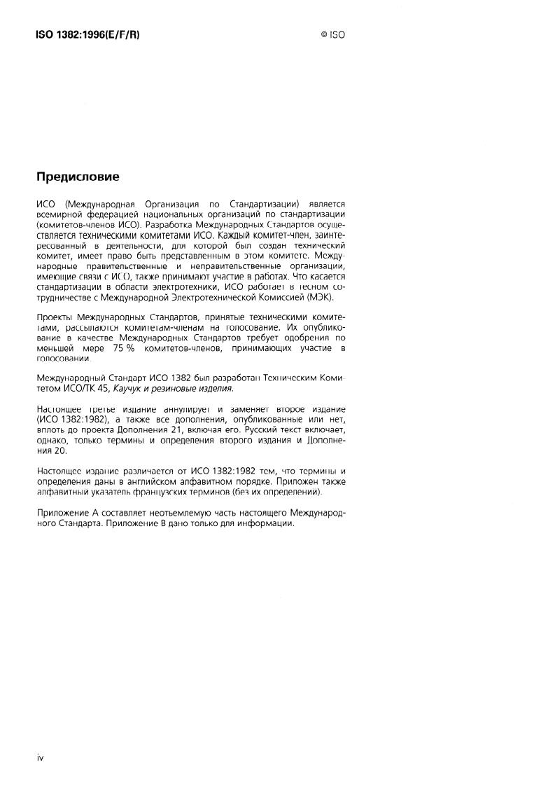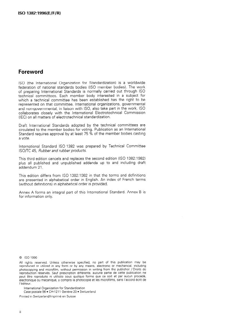 ISO 1382:1996 is a standard published by the International Organization for Standardization (ISO). Its full title is "Rubber — Vocabulary". This standard covers: Defines terms used in the rubber industry. Replaces the second edition.