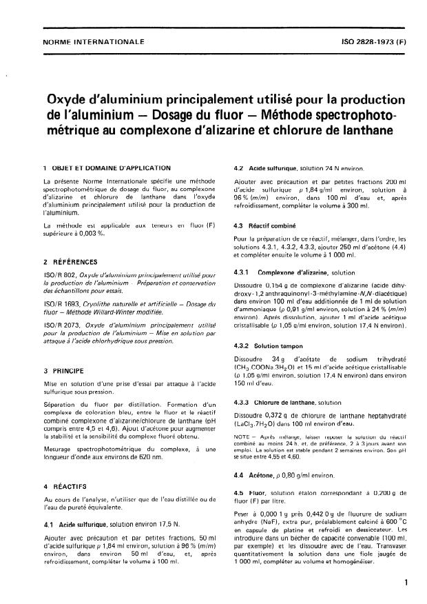 ISO 2828:1973 - Oxyde d'aluminium principalement utilisé pour la production de l'aluminium -- Dosage du fluor -- Méthode spectrophotométrique au complexone d'alizarine et chlorure de lanthane