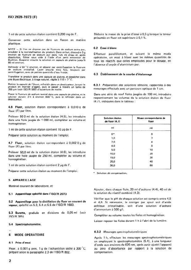 ISO 2828:1973 is a standard published by the International Organization for Standardization (ISO). Its full title is "Aluminium oxide primarily used for the production of aluminium — Determination of fluorine content — Alizarin complexone and lanthanum chloride spectrophotometric method". This standard covers: Applicable to products having F contents of more than 0.003 % (m/m). Dissolution of a test portion by attack by sulphuric acid under pressure. Separation of the fluorine by distillation at a temperature of (150 1) °C by sulphuric acid. The distillation is carried out by the method described in ISO 1693. Formation of a blue coloured complex between fluorine and alizarin complexone/lanthanum chloride reagent at a pH between 4.5 and 4.6. Addition of acetone to increase the stability and sensitivity of the fluorine complex. Spectrophotometric measurement of the complex at a wavelength of about 620 nm. Has also been approved by the IUPAC.