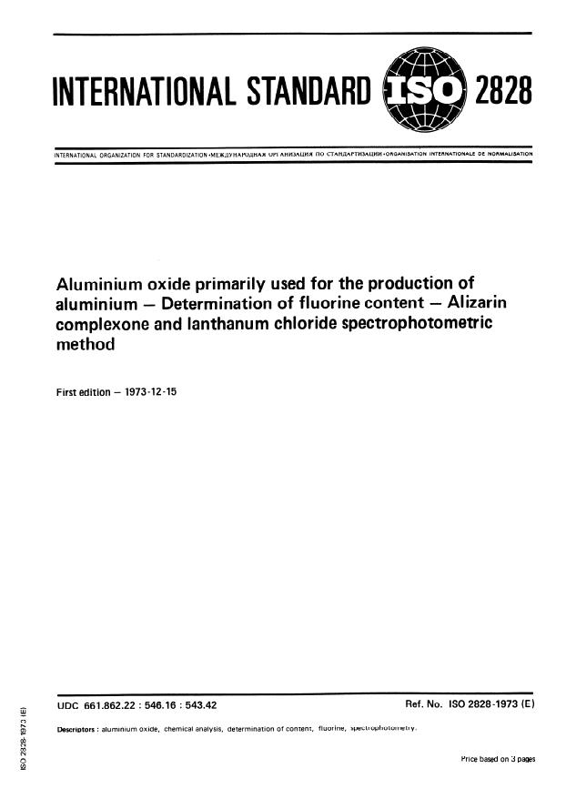 Keywords: ISO 2828, aluminium oxide, fluorine determination, spectrophotometric method, alizarin complexone, lanthanum chloride, fluorine content, chemical analysis, aluminium production, ISO standards, fluorine measurement.