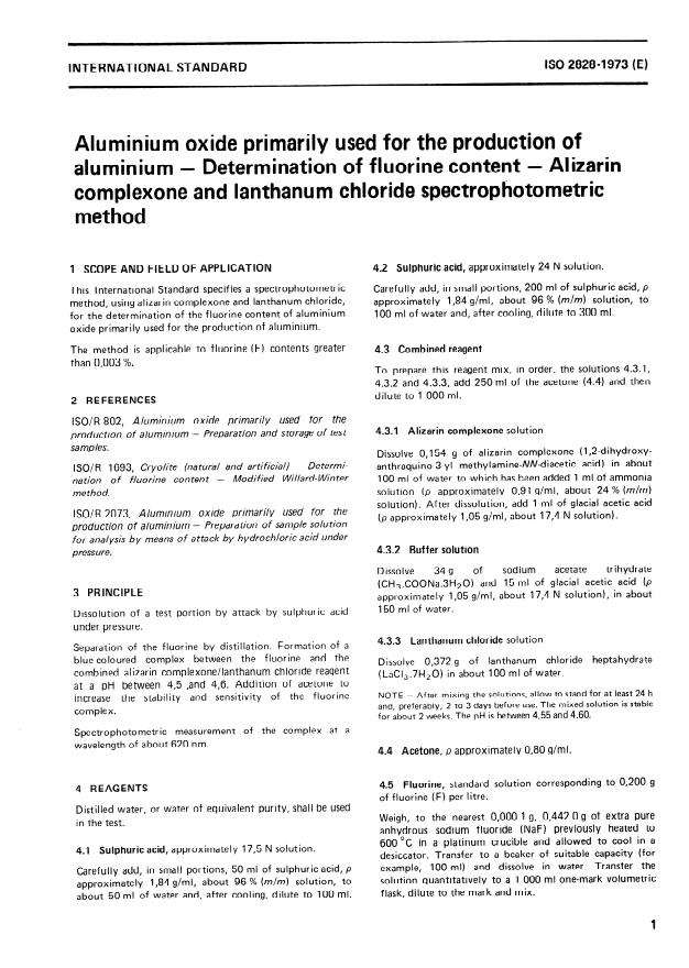 ISO 2828:1973 - Aluminium oxide primarily used for the production of aluminium -- Determination of fluorine content -- Alizarin complexone and lanthanum chloride spectrophotometric method