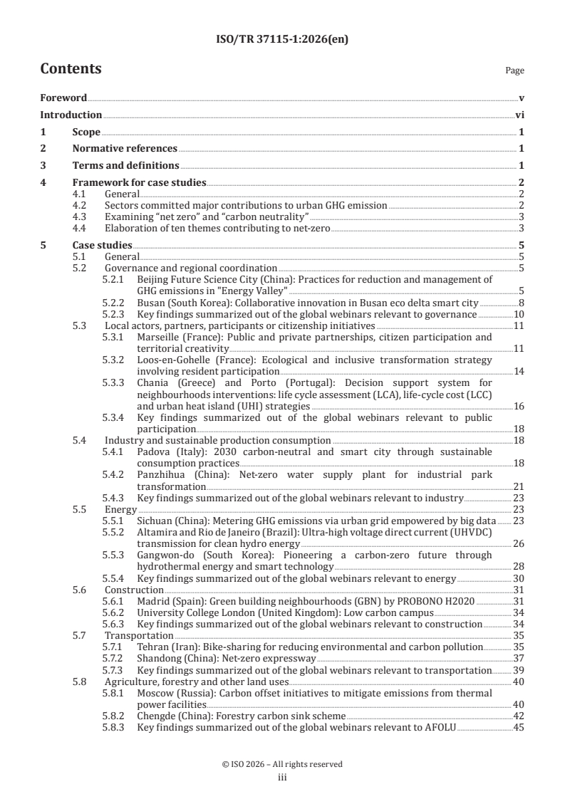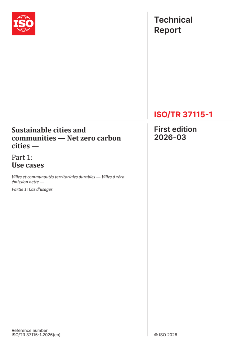ISO/TR 37115-1:2026 is a technical report published by the International Organization for Standardization (ISO). Its full title is "Sustainable cities and communities — Net zero carbon cities — Part 1: Use cases". This standard covers: This document provides use cases on the practices of global cities and communities, including policies, supporting techniques and tools, and management approaches that drive towards achieving lower greenhouse gas (GHG) emissions for cities and communities as a key step towards net zero carbon cities in response to climate change and global carbon neutrality. This document takes into account varying contexts including climate conditions, scale, available resources or economic structures in these practices. This document is in line with the sustainability purposes and issues provided in ISO 37101 that are relevant to GHG emissions.