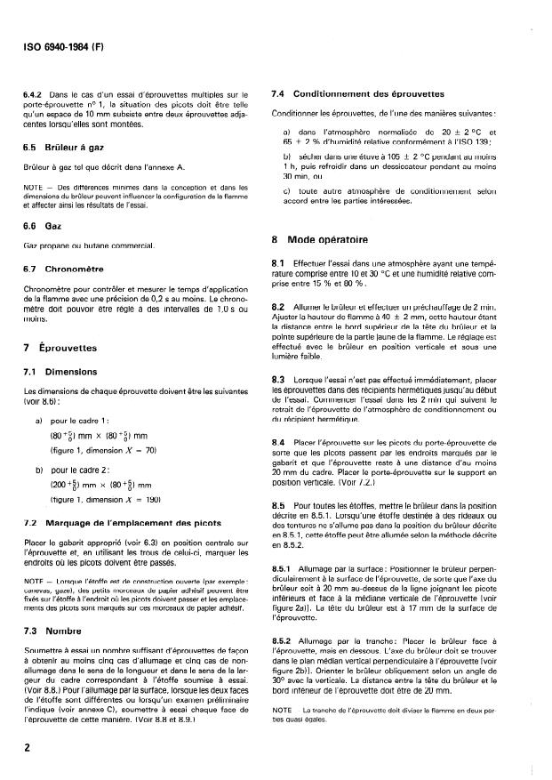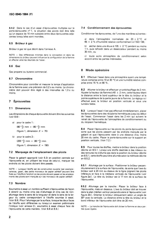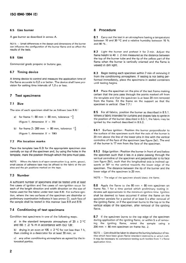 ISO 6940:1984 is a standard published by the International Organization for Standardization (ISO). Its full title is "Textile fabrics — Burning behaviour — Determination of ease of ignition of vertically oriented specimens". This standard covers: Intended for vertical oriented textile fabrics for clothing, curtains and draperies in the form of single- or multi-component (coated, quilted, multilayered, sandwich construction and similar combinations) fabrics. Description and construction of the burner are given in Annex A, example for test results and calculations are contained in Annex B, and details to experimental techniques are included in Annex C.