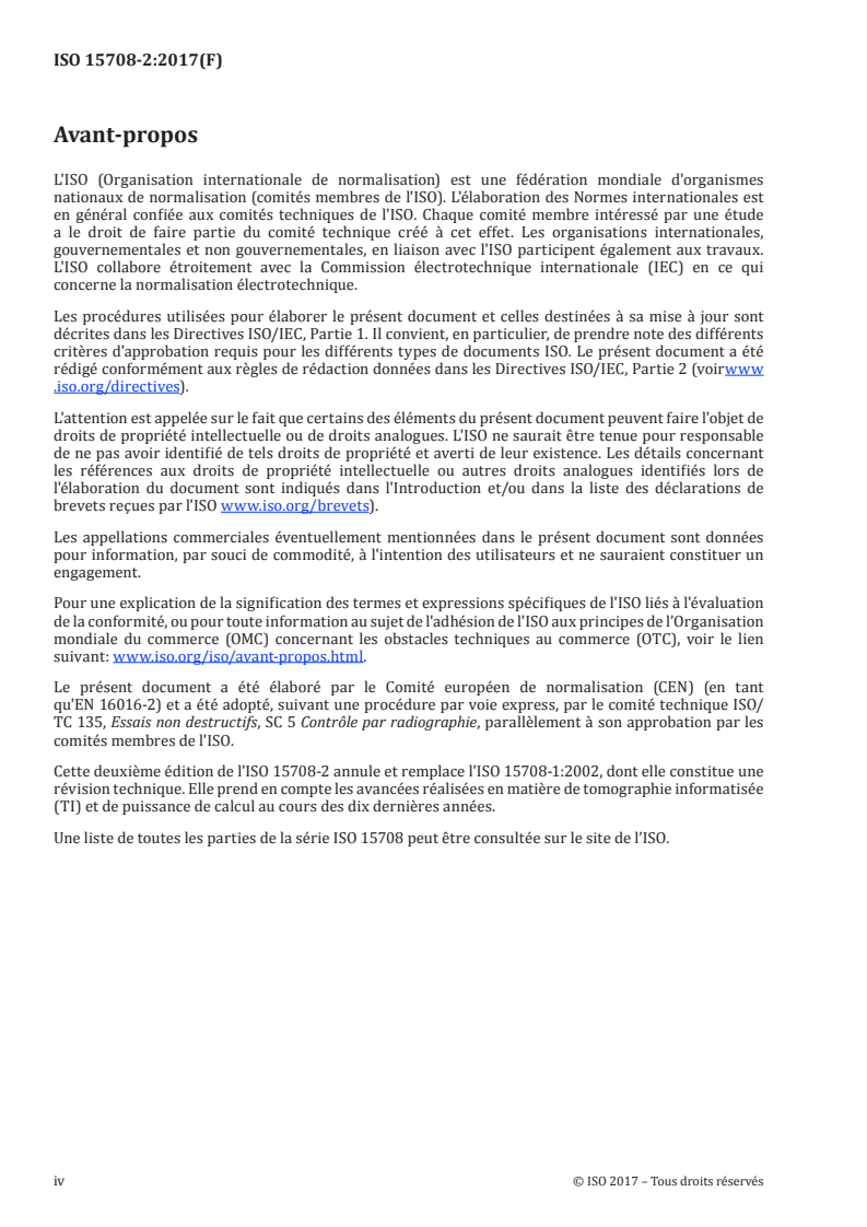 ISO 15708-2:2017 is a standard published by the International Organization for Standardization (ISO). Its full title is "Non-destructive testing - Radiation methods for computed tomography - Part 2: Principles, equipment and samples". This standard covers: ISO 15708-2:2017 specifies the general principles of X-ray computed tomography (CT), the equipment used and basic considerations of sample, materials and geometry. It is applicable to industrial imaging (i.e. non-medical applications) and gives a consistent set of CT performance parameter definitions, including how those performance parameters relate to CT system specifications. ISO 15708-2:2017 deals with computed axial tomography and excludes other types of tomography such as translational tomography and tomosynthesis.