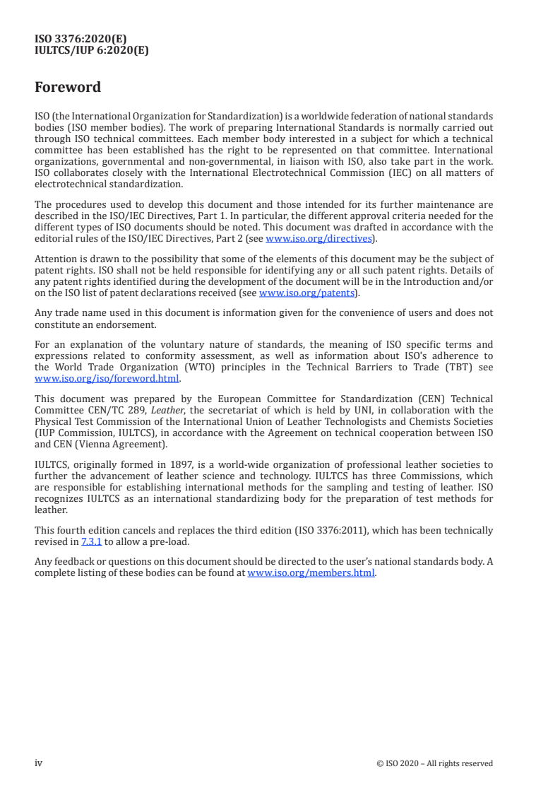 ISO 3376:2020 is a standard published by the International Organization for Standardization (ISO). Its full title is "Leather - Physical and mechanical tests - Determination of tensile strength and percentage elongation". This standard covers: This document specifies a method for determining the tensile strength, elongation at a specified load and elongation at maximum force of leather. It is applicable to all types of leather.