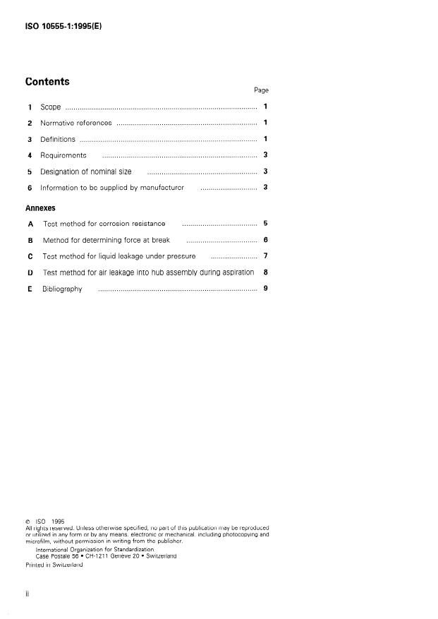ISO 10555-1:1995 is a standard published by the International Organization for Standardization (ISO). Its full title is "Sterile, single-use intravascular catheters — Part 1: General requirements". This standard covers: Specifies general requirements for intravascular catheters, supplied in the sterile condition and intended for single use, for any application. Does not apply to intravascular catheter accessories, which will be covered by a separate standard.