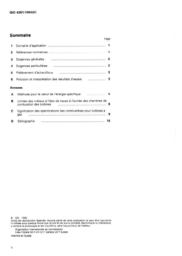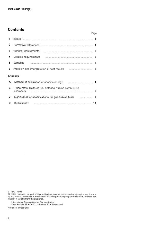 ISO 4261:1993 is a standard published by the International Organization for Standardization (ISO). Its full title is "Petroleum products — Fuels (class F) — Specifications of gas turbine fuels for industrial and marine applications". This standard covers: Sets out the properties of fuels at the time and place of transfer of custody to the user. Does not cover requirements for gas turbine fuels for aviation use. Further information and recommendations for the quality of the fuel entering the turbine combustion chambers (trace metal limits) are provided in annex B. The terminology used and the test methods referred to in these specifications are presented in annex C.