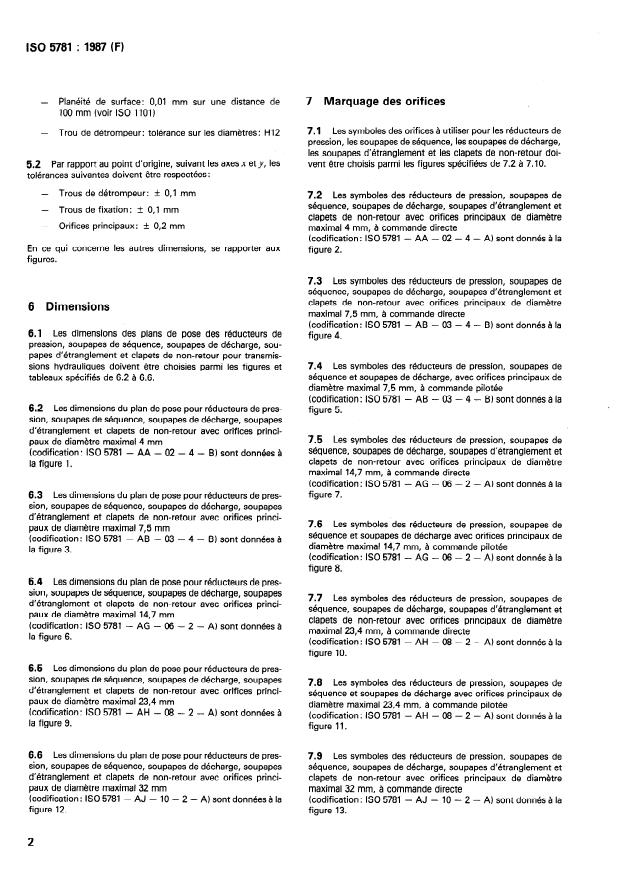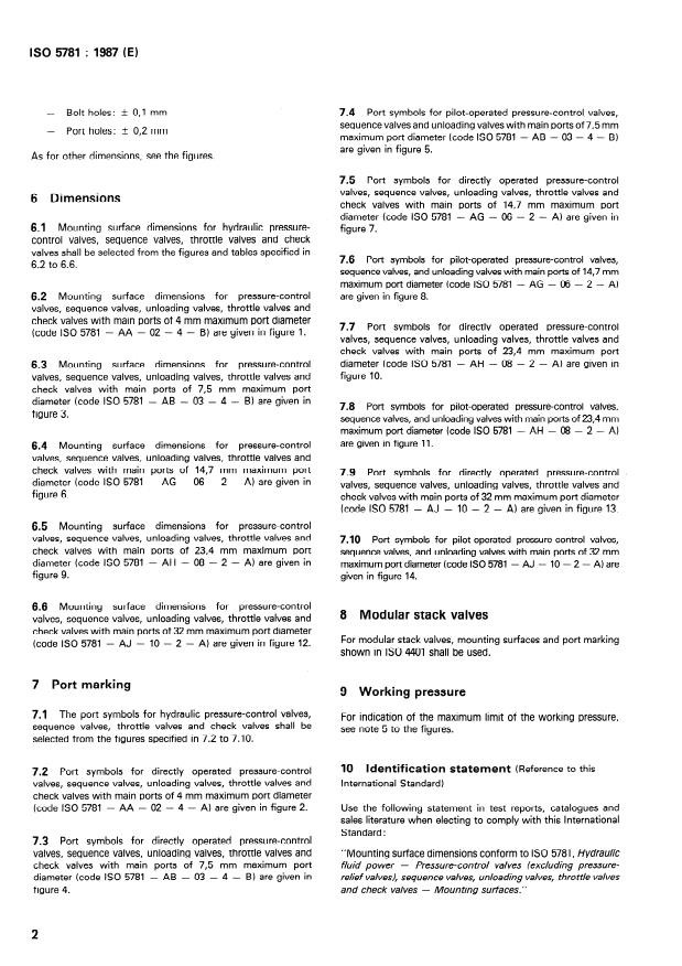 ISO 5781:1987 is a standard published by the International Organization for Standardization (ISO). Its full title is "Hydraulic fluid power — Pressure-control valves (excluding pressure-relief valves), sequence valves, unloading valves, throttle valves and check valves — Mounting surfaces". This standard covers: Hydraulic fluid power — Pressure-control valves (excluding pressure-relief valves), sequence valves, unloading valves, throttle valves and check valves — Mounting surfaces