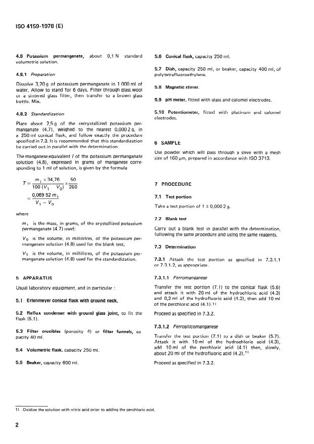 ISO 4159:1978 is a standard published by the International Organization for Standardization (ISO). Its full title is "Ferromanganese and ferrosilicomanganese - Determination of manganese content - Potentiometric method". This standard covers: The method is applicable to alloys containing from 55 to 95 % (m/m) manganese. Specifies principle, reagents, apparatus, sample, procedure, expression of results, reproducibility and test report. Warns of perchloric acid fumes.