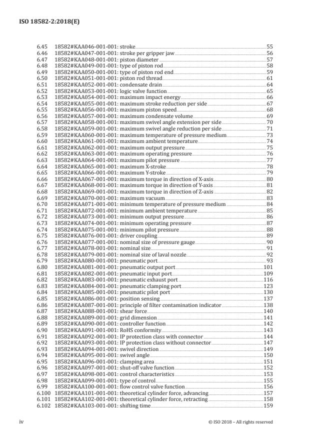 ISO 18582-2:2018 is a standard published by the International Organization for Standardization (ISO). Its full title is "Fluid power — Specification of reference dictionary — Part 2: Definitions of classes and properties of pneumatics". This standard covers: This document specifies a reference dictionary of standardized product properties for the area of pneumatic fluid power on the basis of ISO 18582-1. The properties are determined on the basis of standardized attributes.