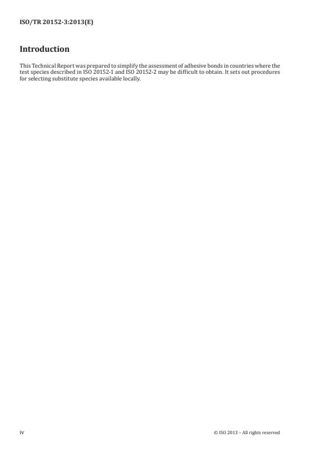 ISO/TR 20152-3:2013 is a Technical Report published by the International Organization for Standardization (ISO) that focuses on the bond performance of adhesives used in timber structures. Specifically, this part of the ISO 20152 series addresses the use of alternative wood species for adhesive bond testing. It provides standardized procedures for recognizing new wood species as substitutes for the species specified in ISO 20152-1 and ISO 20152-2, facilitating adhesive evaluation when traditional test species are unavailable locally. This standard is crucial for regions with diverse or inaccessible timber resources, ensuring consistent adhesive performance assessment in engineered wood products.