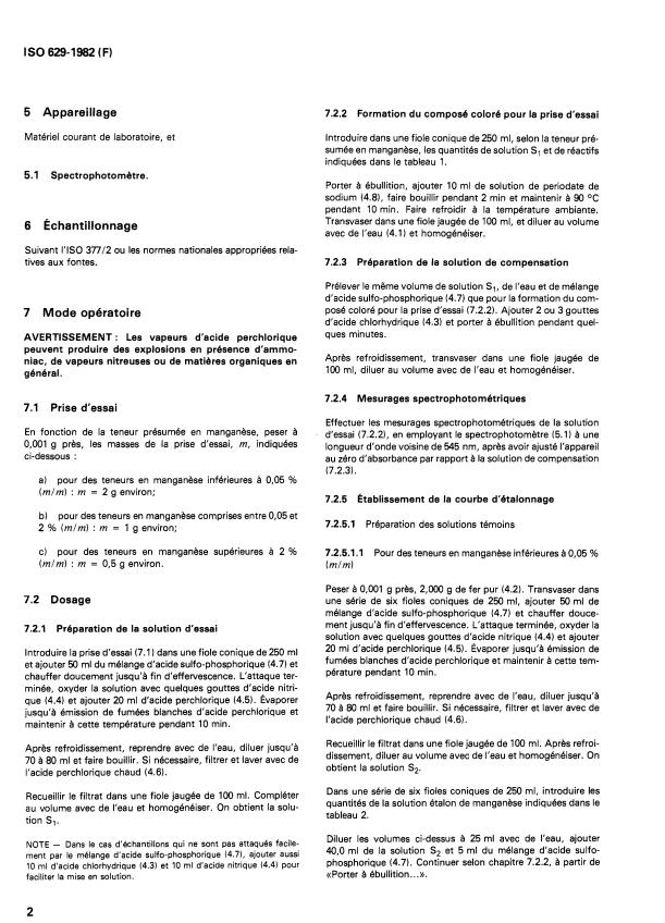 ISO 629:1982 - Aciers et fontes -- Dosage du manganese -- Méthode spectrophotométrique