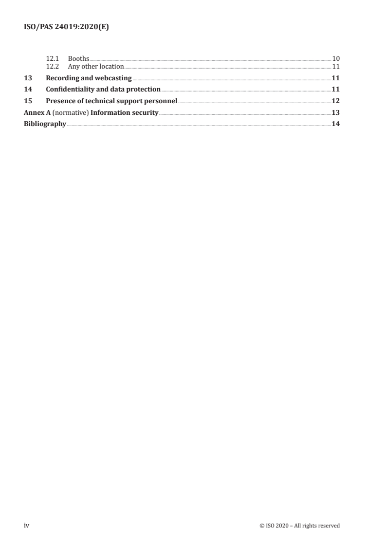 ISO/PAS 24019:2020 is a technical specification published by the International Organization for Standardization (ISO). Its full title is "Simultaneous interpreting delivery platforms — Requirements and recommendations". This standard covers: This document specifies requirements and recommendations for using simultaneous interpreting delivery platforms in settings where the interpreters are, or are not, in the same room as participants and speakers at a communicative event. In conjunction with ISO 20108, this document provides the relevant requirements and recommendations for the quality and transmission of sound and image to interpreters and from interpreters to participants, and for the configuration of the interpreter's working environment.