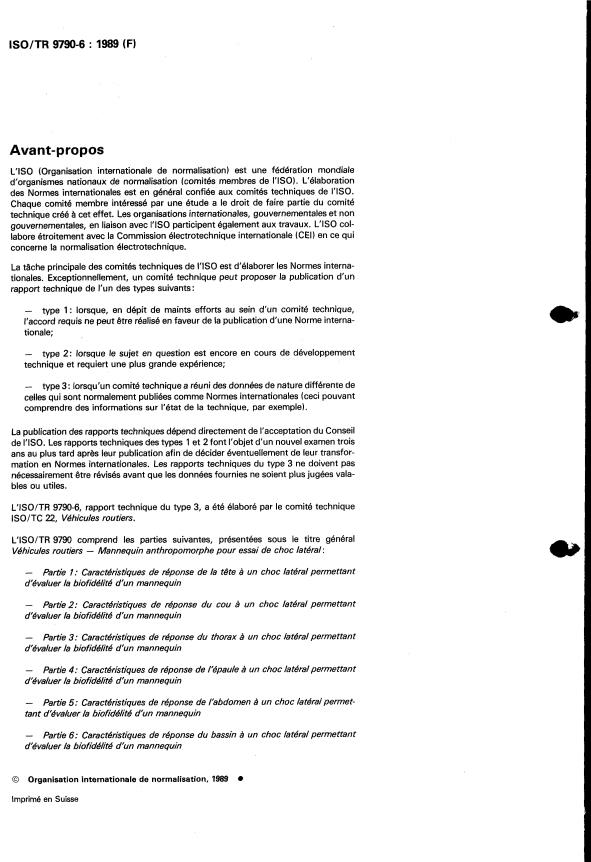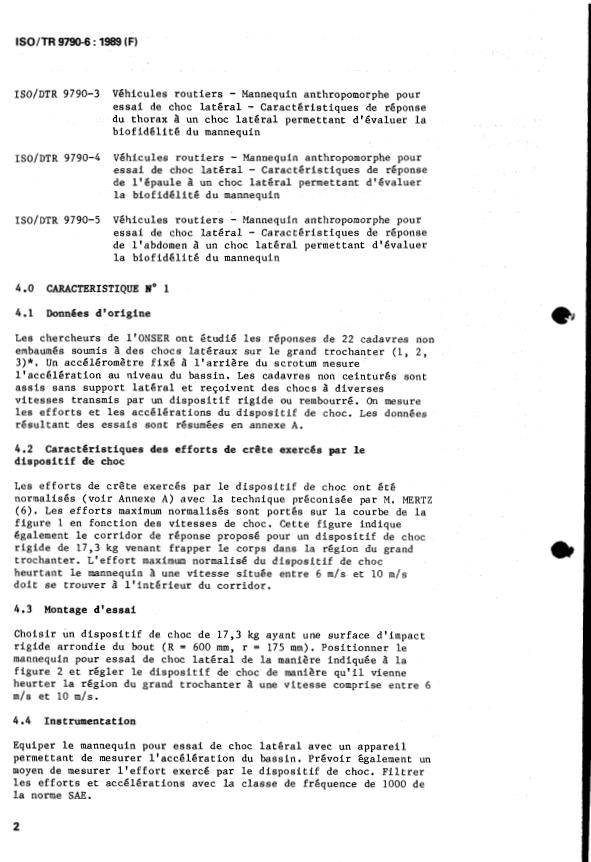 ISO/TR 9790-6:1989 - Véhicules routiers -- Mannequin anthropomorphe pour essai de choc latéral